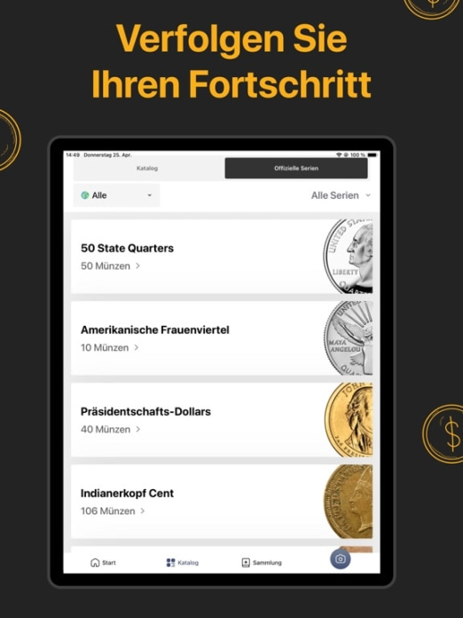 Einfache Verwaltung Ihrer Münzsammlung. Exportieren und teilen Sie Ihre persönliche Sammlung bequem mit anderen. Organisieren Sie Ihre Münzen nach Serien, Ländern oder Nennwert und behalten Sie den aktuellen Gesamtwert Ihrer Sammlerstücke immer im Blick.